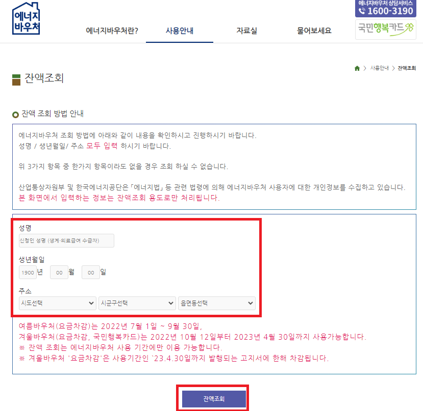 에너지바우처 공식 홈페이지에 접속하셔서 가운데 잔액조회 클릭하시고 성명, 생년월일, 주소 입력하시고