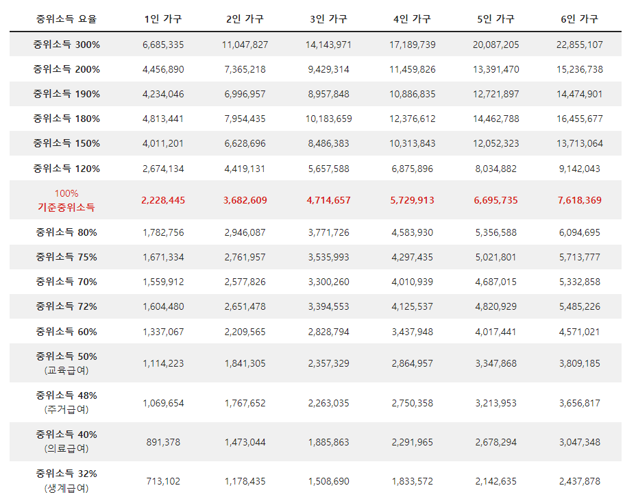 1인 가구부터 6인 가구 까지의 32% ~ 300% 해당되는 기준중위소득 확인표 입니다. 정부지원 신청시 위 자료를 참고하시기 바랍니다.